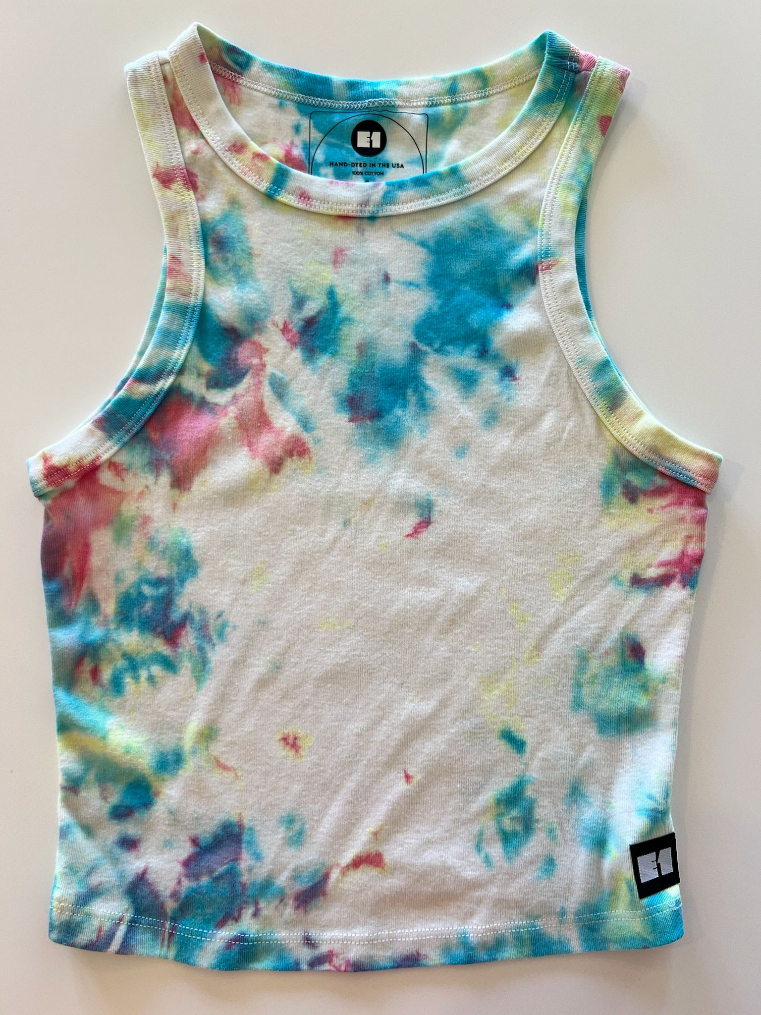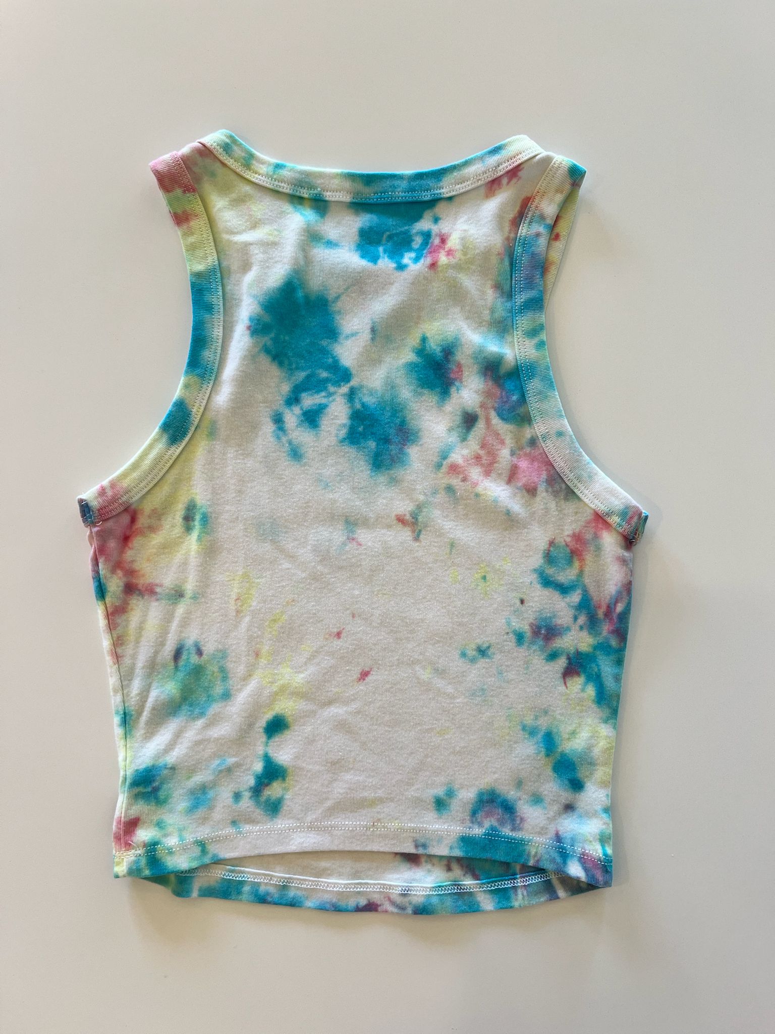 This piece began as a blank and was transformed using a an ice dye bath method that creates intricate, organic patterns. I layered in the dye to achieve this Confetti color palette.